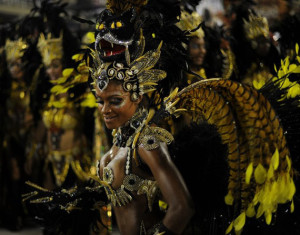 A reveller of Beija-Flor samba school dances during the first night of carnival parade at the Sambadrome in Rio de Janeiro on February 20, 2012. AFP PHOTO / CHRISTOPHE SIMON (Photo credit should read CHRISTOPHE SIMON/AFP/Getty Images)