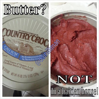 The Country Crock butter was only used for butter the many months ago when Haitian mothers originally purchased the butter. Once they ran out of butter, you could expect to find epis, tomato paste or sometimes vegetable oil in the container.