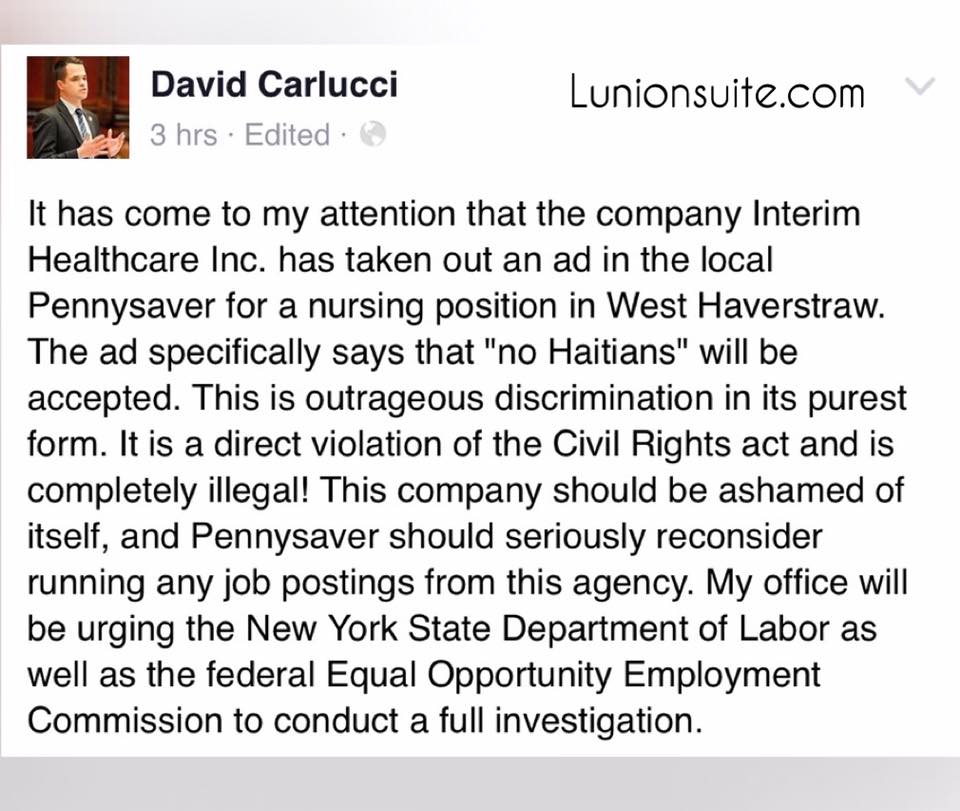 It has come to my attention that the company Interim Healthcare Inc. has taken out an ad in the local Pennysaver for a nursing position in West Haverstraw. The ad specifically says that “no Haitians” will be accepted. This is outrageous discrimination in its purest form.