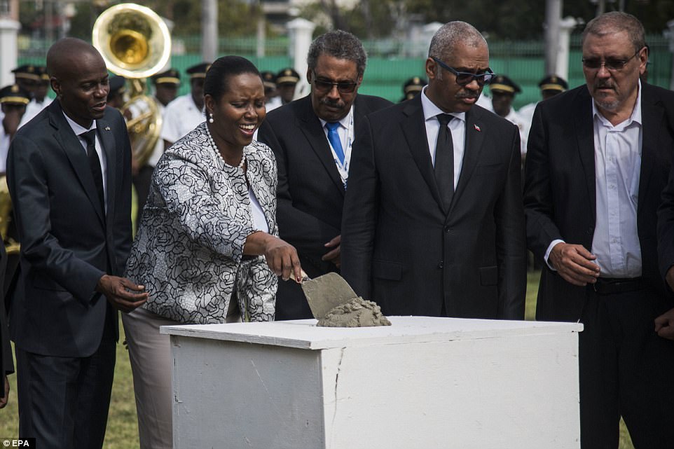 Haitian First Lady, Marine Moise, places the cement for the first stone of the reconstruction of the National Palace