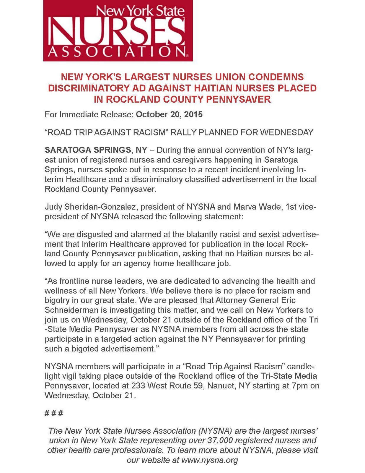 NYSNA members will participate in a “Road Trip Against Racism” candlelight vigil taking place outside of the Rockland office of the Tri-State Media Pennysaver, located at 233 West Route 59, Nanuet, NY starting at 7pm on Wednesday, October 21.