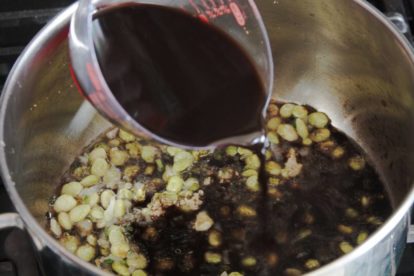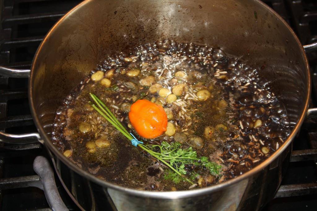 - Add 5 1/2 – 6 cups of the reserved liquid to pot along with thyme and scotch bonnet.
