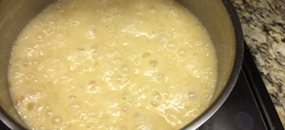 Once sugar dissolves, raise heat to high and continue stirring for 20 – 25 min or until mix has a lava consistency. If you have a candy thermometer it will be around